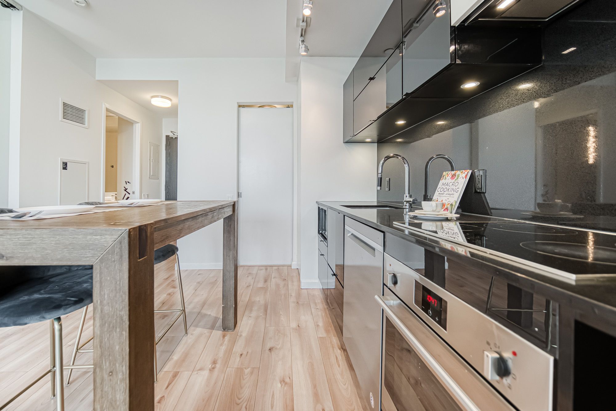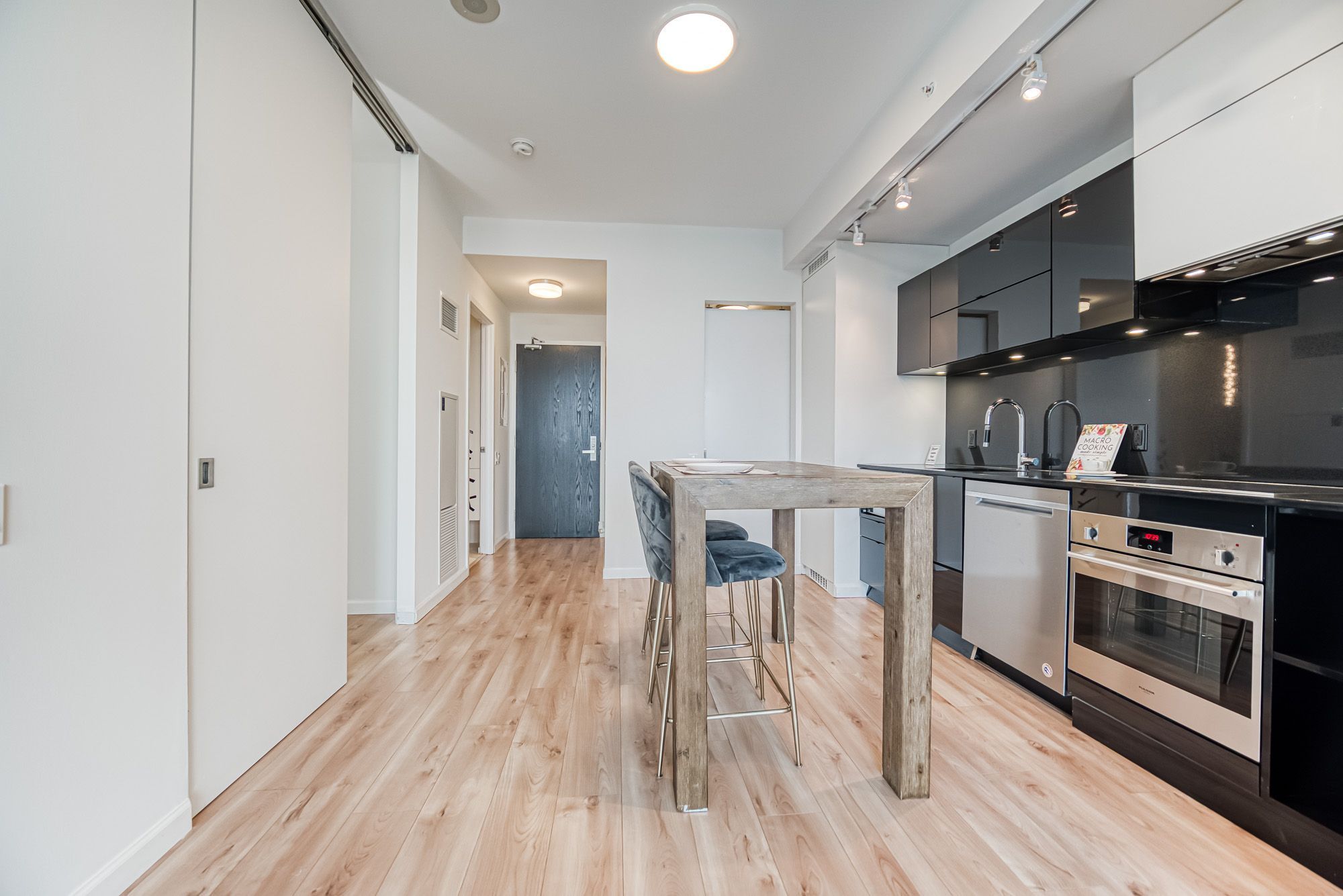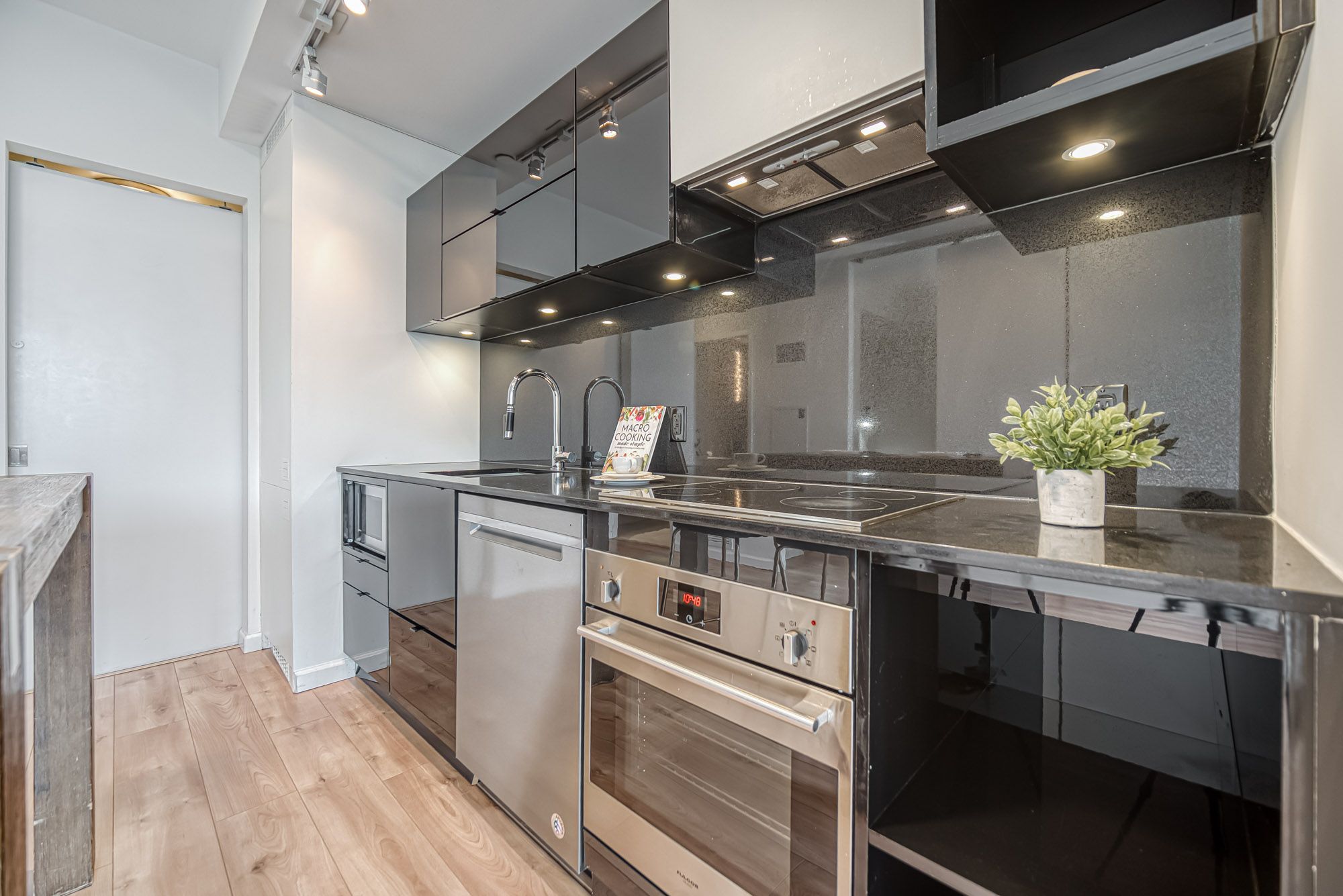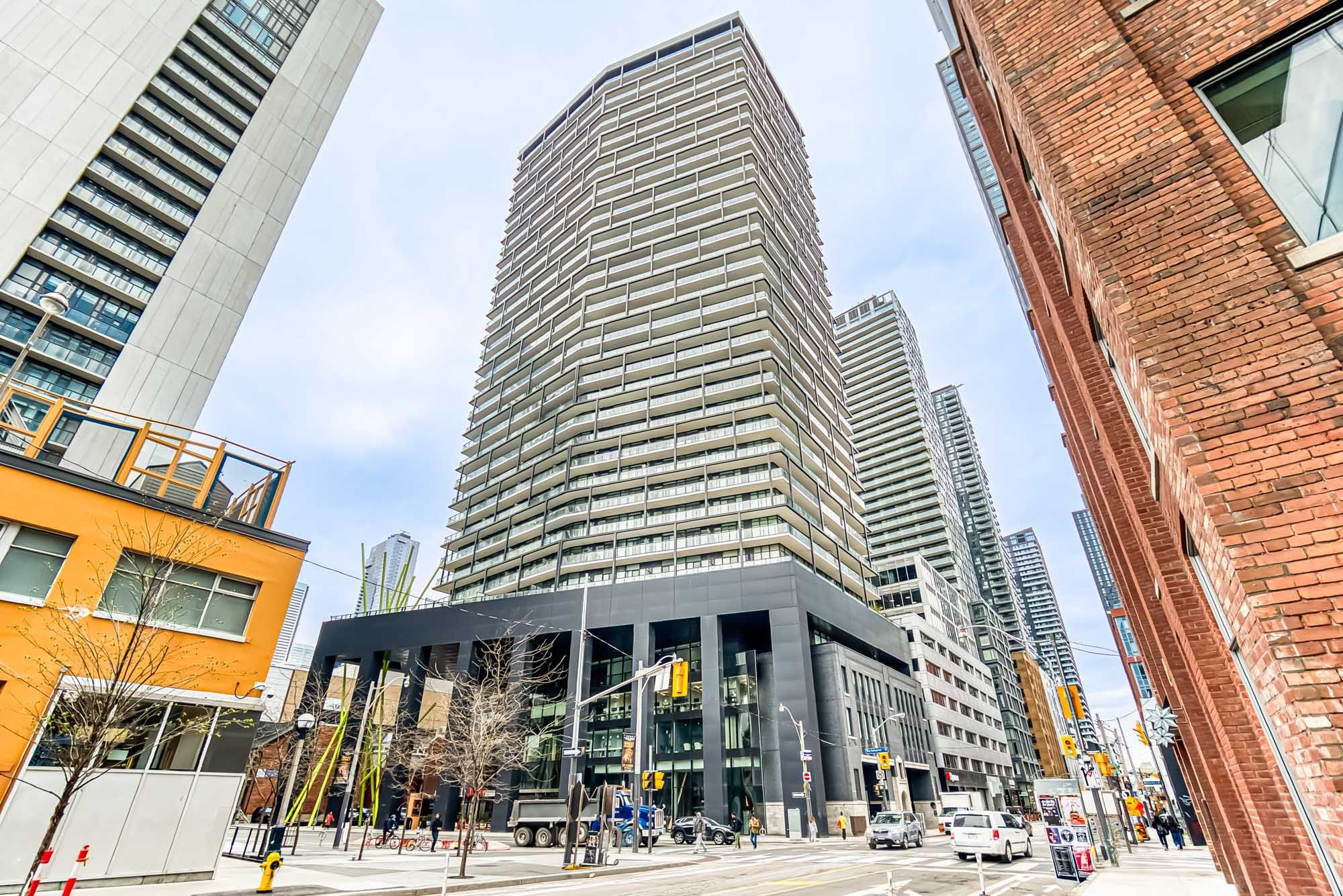 Prime Location, Luxurious Tableau Condo in Downtown Toronto! Rare to find 1 + LARGE Den that can be used for a 2nd Bedroom! High 9-foot ceilings throughout most of the unit (except for small entrance section with ductwork). Functional layout of 590 Sq Ft + Large 105 Sq Ft Balcony on the 28th floor + locker. Freshly painted wall (2025) and New Laminate Floor (2024). Ensuite walk-in Laundry Room offers extra storage room with coat rack and W/D. Bright unit with Walls Of Windows and expansive, unobstructed outlook. Features an Open-Concept Design Modern Kitchen equipped with a Built-In Fridge, Stove, Oven, And Dishwasher. Well-managed building with low maintenance fee. Look forward to an enhanced lifestyle with resort-like amenities such as Onsite Gym & Yoga studio, Sauna Room, Party Lounge & Pool Table, Media & Guest Suites, Visitor Parking, and Outdoor Deck with BBQ Grills. LOCATION: Perfectly situated in Downtown Toronto's core. Close proximity to PATH, Financial/Entertainment District, Theatres (TIFF), University Health Network, Northeastern University, U Of T, TMU, George Brown, OCAD, And TTC Access.