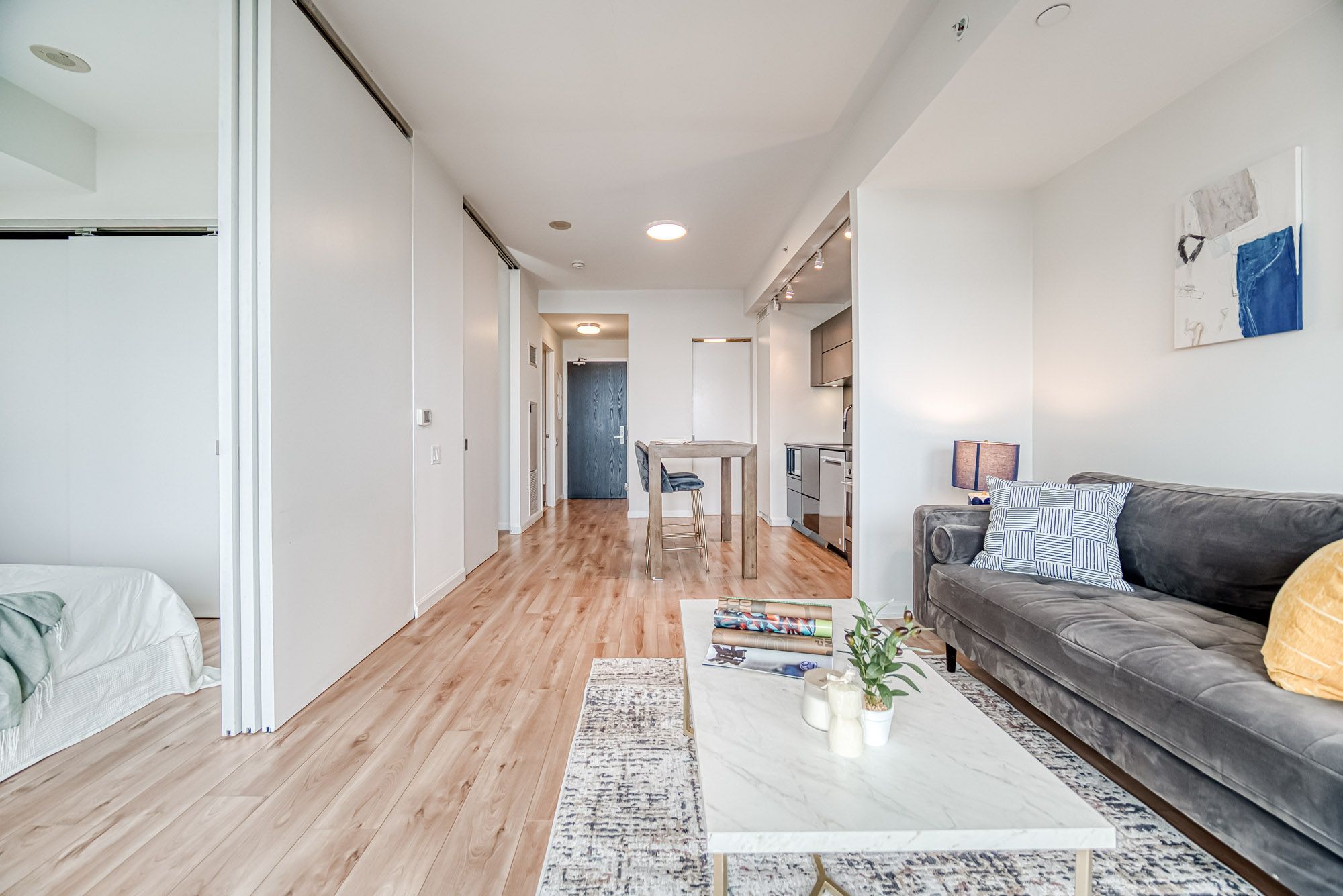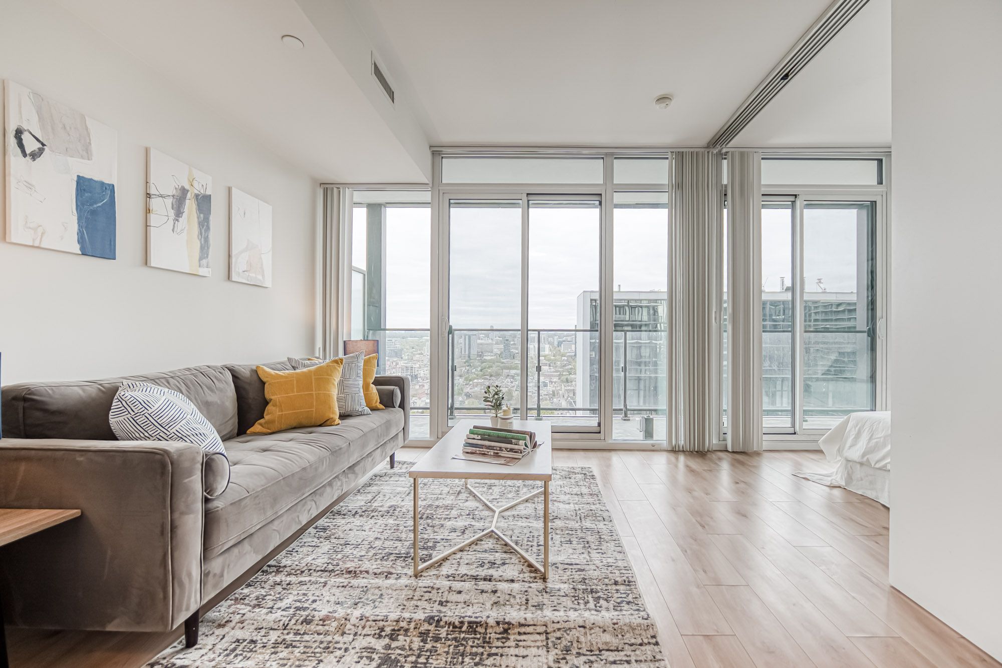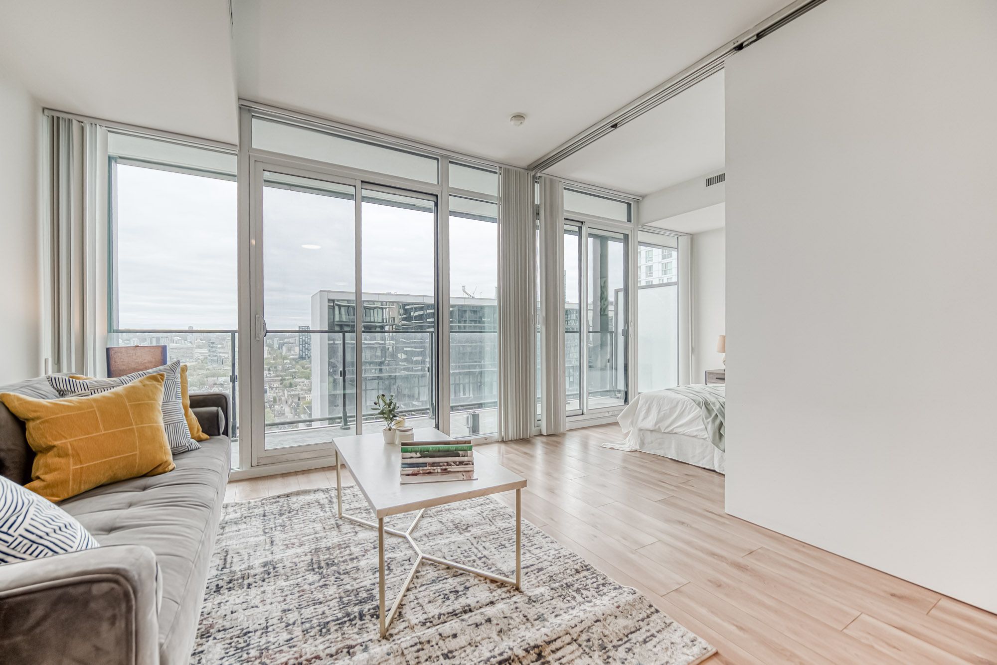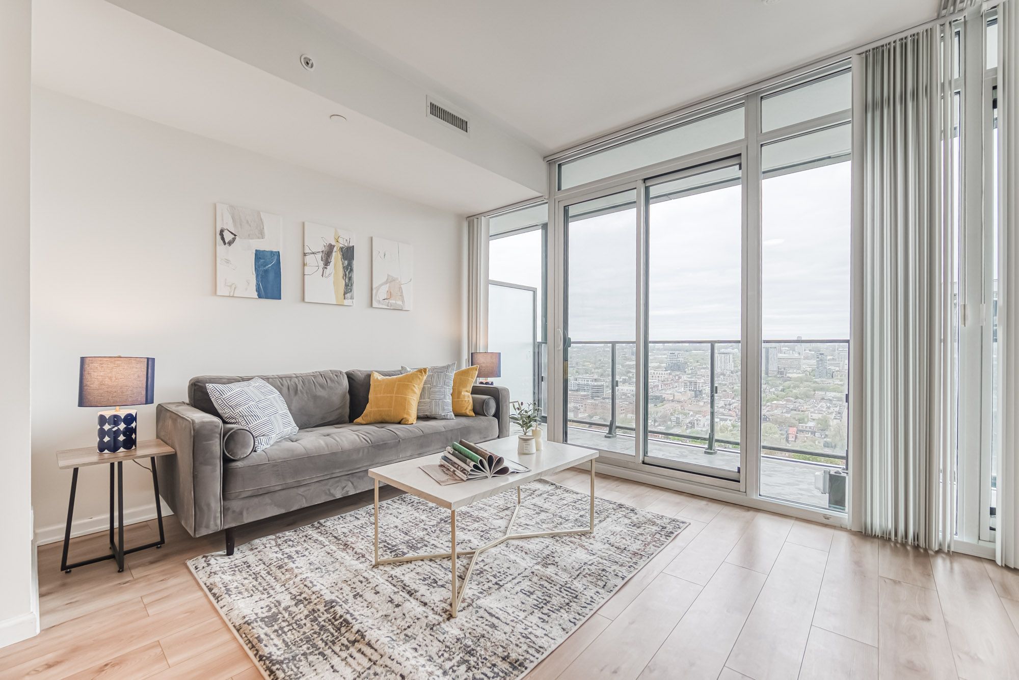Prime Location, Luxurious Tableau Condo in Downtown Toronto! Rare to find 1 + LARGE Den that can be used for a 2nd Bedroom! High 9-foot ceilings throughout most of the unit (except for small entrance section with ductwork). Functional layout of 590 Sq Ft + Large 105 Sq Ft Balcony on the 28th floor + locker. Freshly painted wall (2025) and New Laminate Floor (2024). Ensuite walk-in Laundry Room offers extra storage room with coat rack and W/D. Bright unit with Walls Of Windows and expansive, unobstructed outlook. Features an Open-Concept Design Modern Kitchen equipped with a Built-In Fridge, Stove, Oven, And Dishwasher. Well-managed building with low maintenance fee. Look forward to an enhanced lifestyle with resort-like amenities such as Onsite Gym & Yoga studio, Sauna Room, Party Lounge & Pool Table, Media & Guest Suites, Visitor Parking, and Outdoor Deck with BBQ Grills. LOCATION: Perfectly situated in Downtown Toronto's core. Close proximity to PATH, Financial/Entertainment District, Theatres (TIFF), University Health Network, Northeastern University, U Of T, TMU, George Brown, OCAD, And TTC Access.